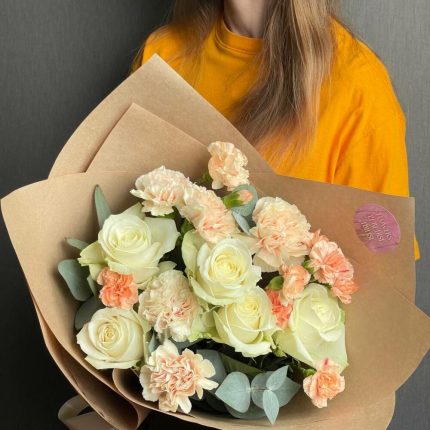 Букет Нимфа с кустовыми пионовидными и одноголовыми розами