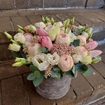 Бархатный цилиндр из тюльпанов, озотамнуса и пионовидной розы