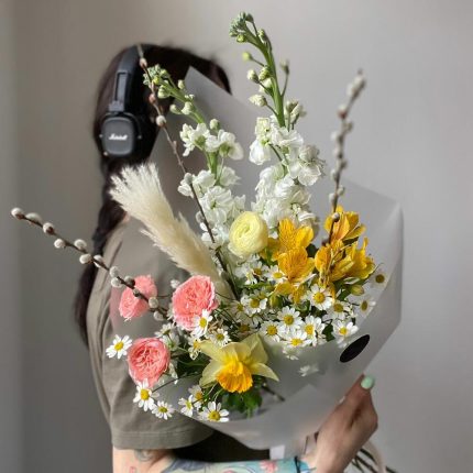 Альстромерии, Маттиола, Нарциссы, Полевые цветы, Ранункулюс, Розы, Ромашки