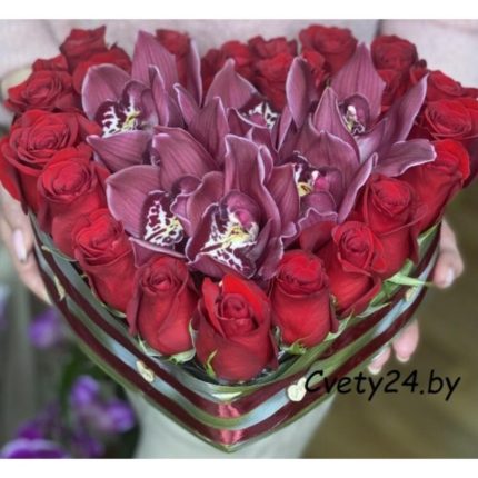 Корзина с розовыми, желтыми и зелеными орхидеями “Тропический сад орхидей”