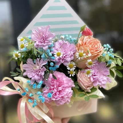 Цветы в большой коробке: садовые розы, лизиантус, маттиола, тюльпаны