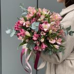 Альстромерия – 15 шт. Эвкалипт – 2 шт. оформление – ленты – 1 шт.