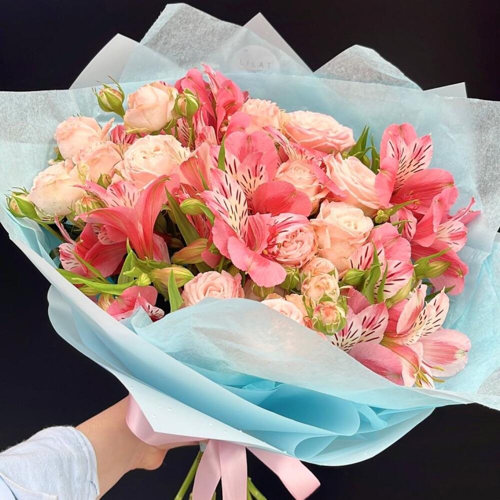Альстромерии, Кустовые розы, Лизиантусы, Пионовидные розы, Розы, Ромашки