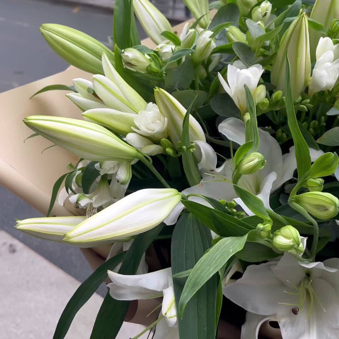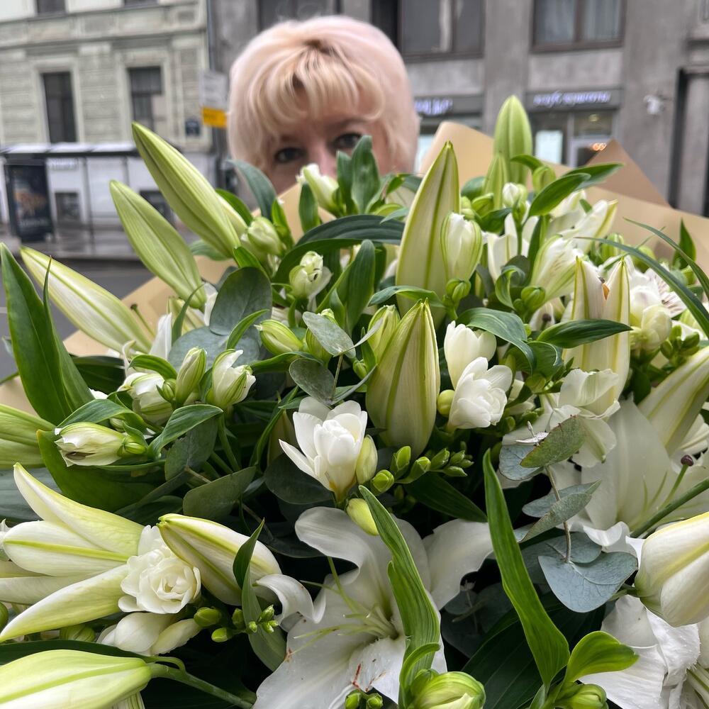 Эвкалипт – 10 шт.Лента атласная – 4 шт.Альстромерия белая – 10 шт.Фрезия белая – 9 шт.Лилия белая – 9 шт.Упаковка корейская пленка – 2 шт.