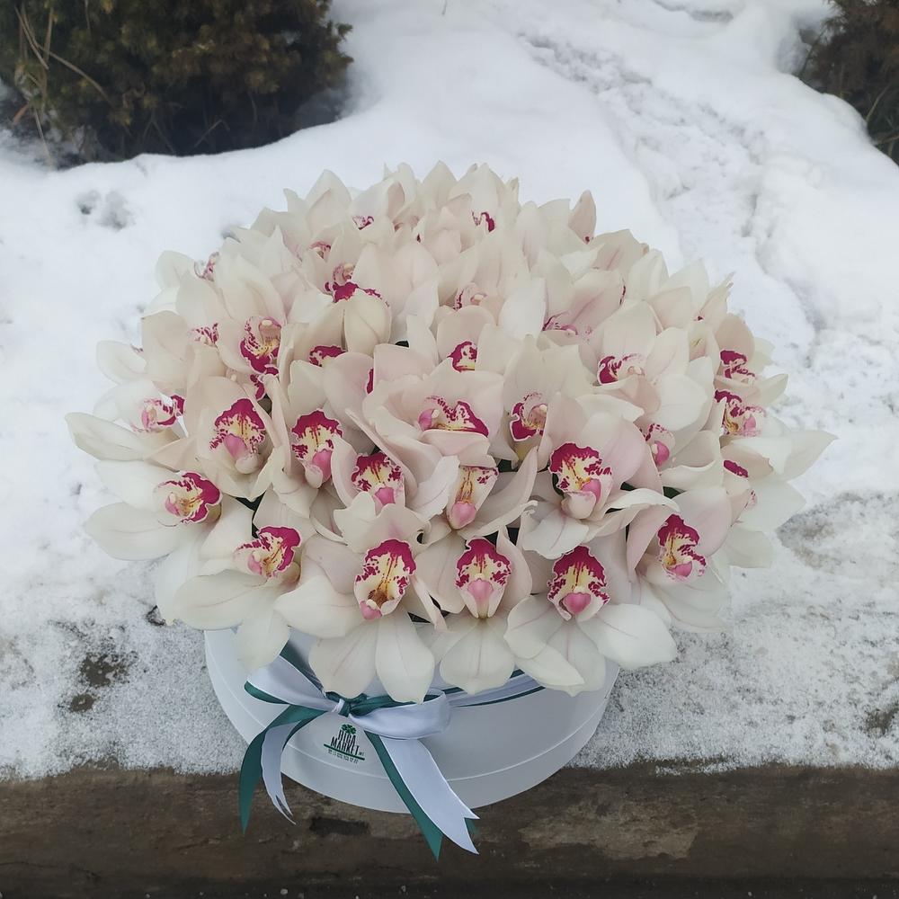 Лента атласная – 1 шт.Коробка шляпная – 1 шт.Оазис флористический – 3 шт.Цимбидиум белый – 45 шт.