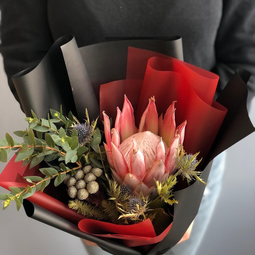 Протея – 1 шт.Бруния – 1 шт.Эвкалипт – 2 шт.Эрингиум – 1 шт.Упаковка дизайнерская – 2 шт.Лента атласная – 2 шт.