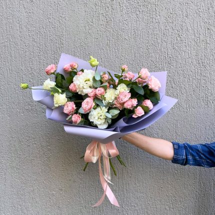 peony spray rose – 7 шт. Lisianthus – 3 шт. gift message card – 1 шт. packaging design – 2 шт. care instruction – 1 шт. free delivery – 1 шт.