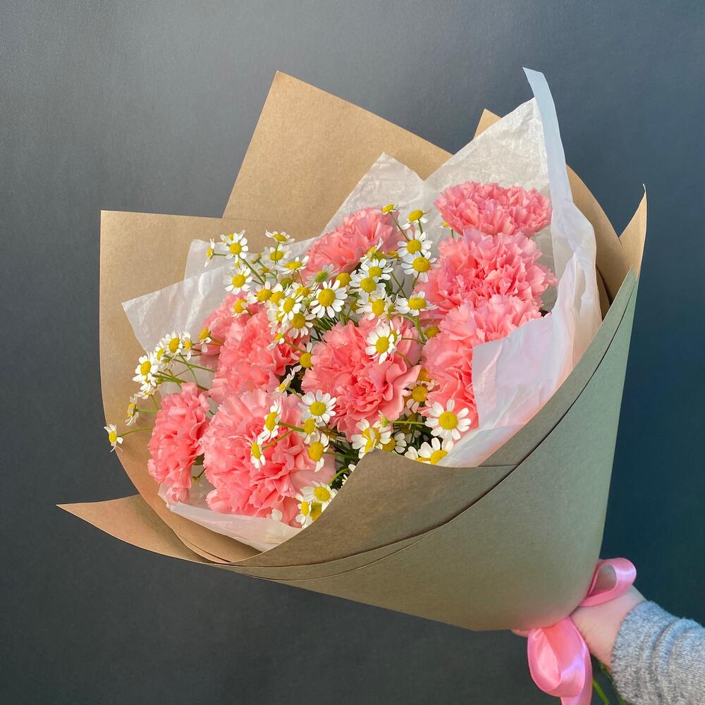 Крафт упаковка – 1 шт.Тишью белое – 2 шт.ромашка матрикария танацетум – 3 шт.диантус розовый (гвоздика ) – 9 шт.зелень декоративная фисташка ветка – 1 шт.