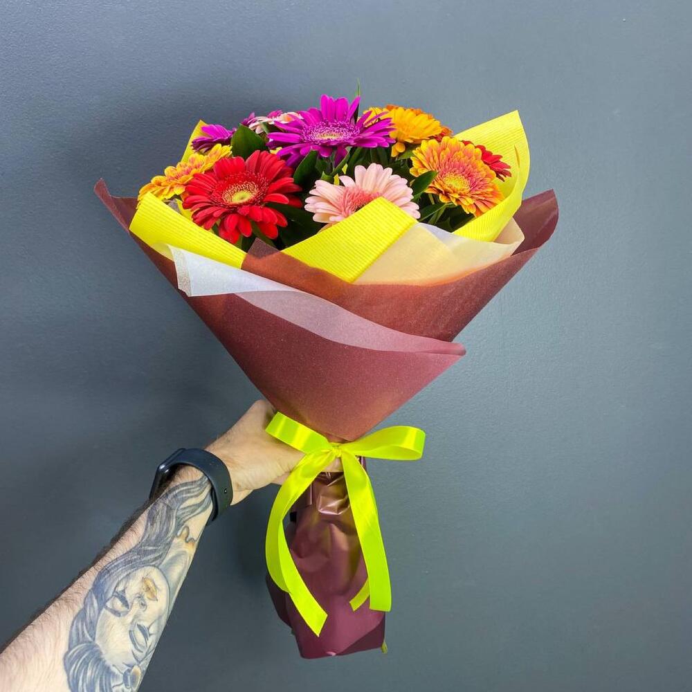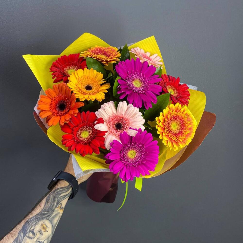 Рускус – 8 шт.Лента атласная – 1 шт.Гербера – 11 шт.Упаковка дизайнерская – 1 шт.