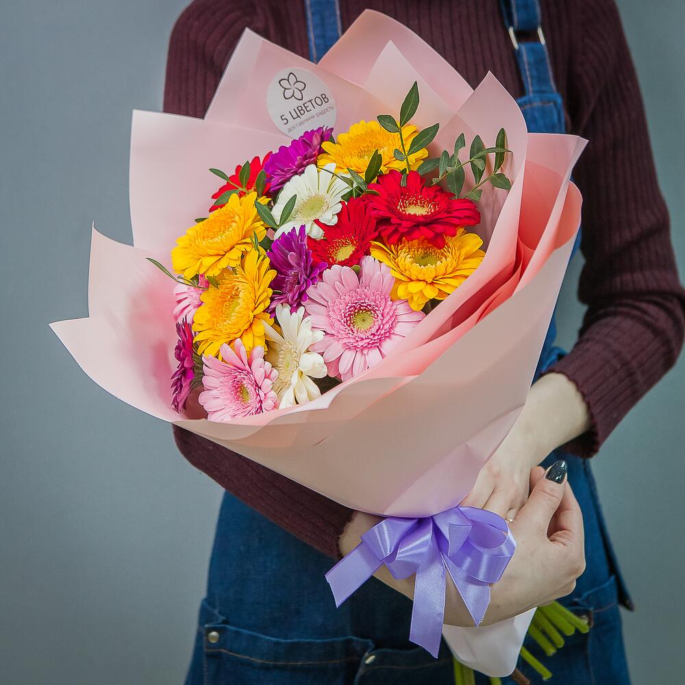 Гербера белая – 3 шт.Гербера желтая – 3 шт.Гербера розовая – 5 шт.Гербера красная – 4 шт.