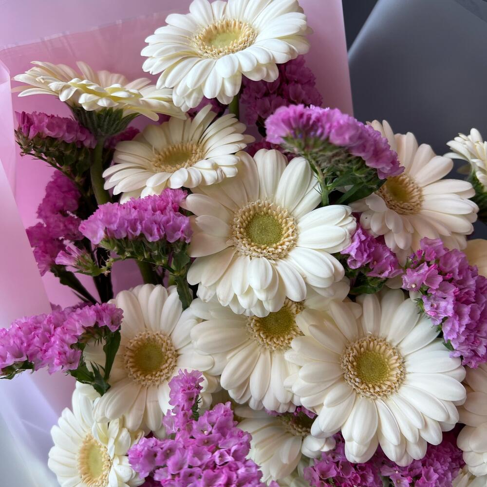 Гербера – 21 шт.Статица – 4 шт.декоративная упаковка – 1 шт.Атласная лента – 1 шт.