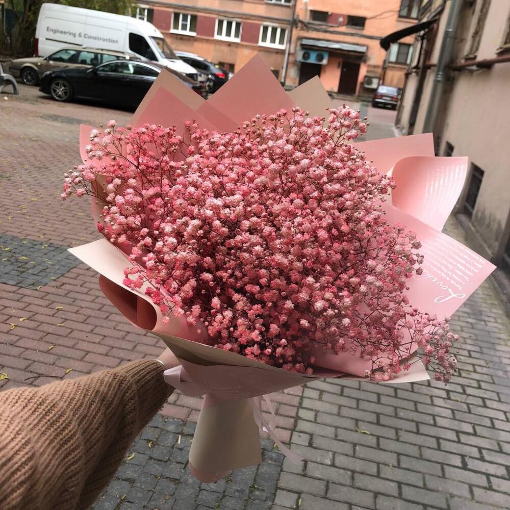 Корейская пленка – 2 шт.Атласная лента – 1 шт.гипсофила окрашенная розовая – 5 шт.