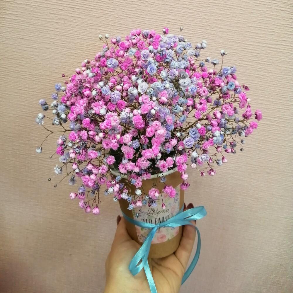 Микс гипсофилы, цвета могут быть разные, которые есть в наличии на момент заказа. Гипсофила радужная в флористическом стакане с использованием оазиса. Очень ароматный комплимент.