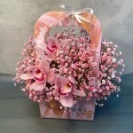 Гипсофила – 6 шт.Орхидея Цимбидиум – 3 шт.Лента атласная – 2 шт.Оазис флористический – 1 шт.Сумка крафт – 1 шт.