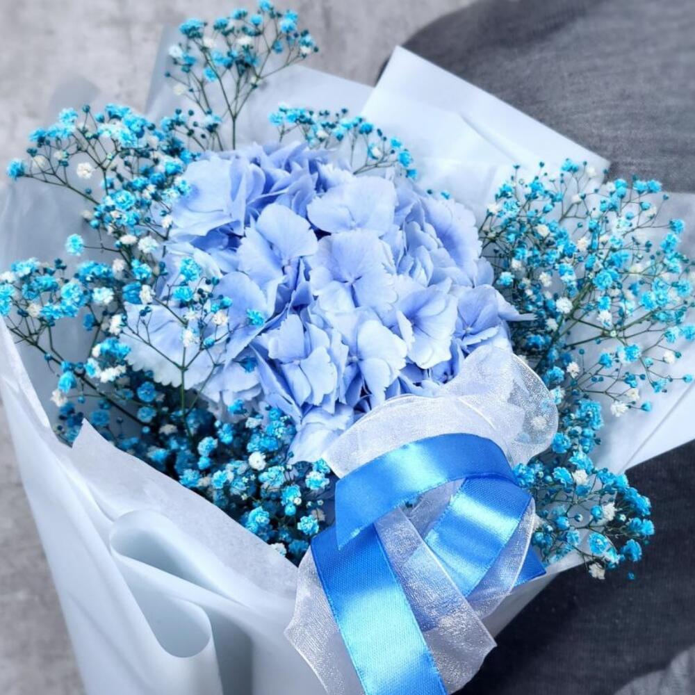 Гипсофила – 2 шт.Гортензия – 1 шт.Лента атласная – 1 шт.Упаковка дизайнерская – 1 шт.