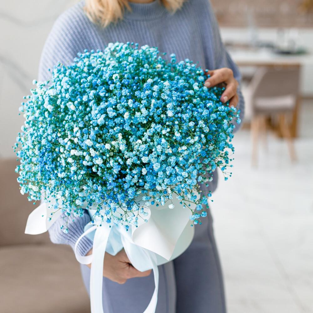 цветная гипсофила – 13 шт.Коробка шляпная – 1 шт.Губка флористическая – 2 шт.Лента атласная – 2 шт.Бумага тишью – 1 шт.