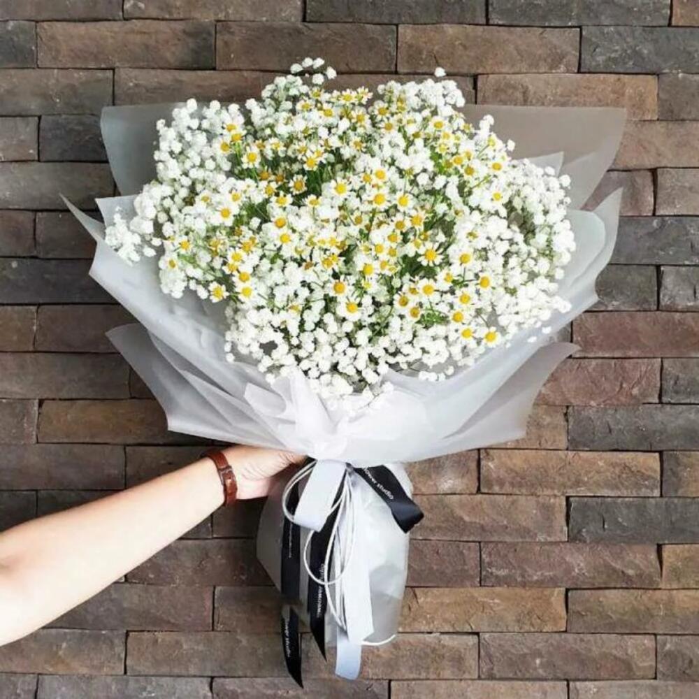 ромашки – 11 шт.Гипсофила – 10 шт.Упаковка дизайнерская – 1 шт.Лента атласная – 2 шт.Пакет подарочный – 1 шт.