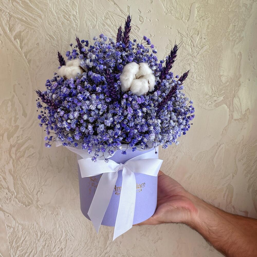 Гипсофила – 7 шт. Хлопок – 3 шт. Коробка шляпная – 1 шт. Пшеница – 11 шт. Оазис флористический – 1 шт.