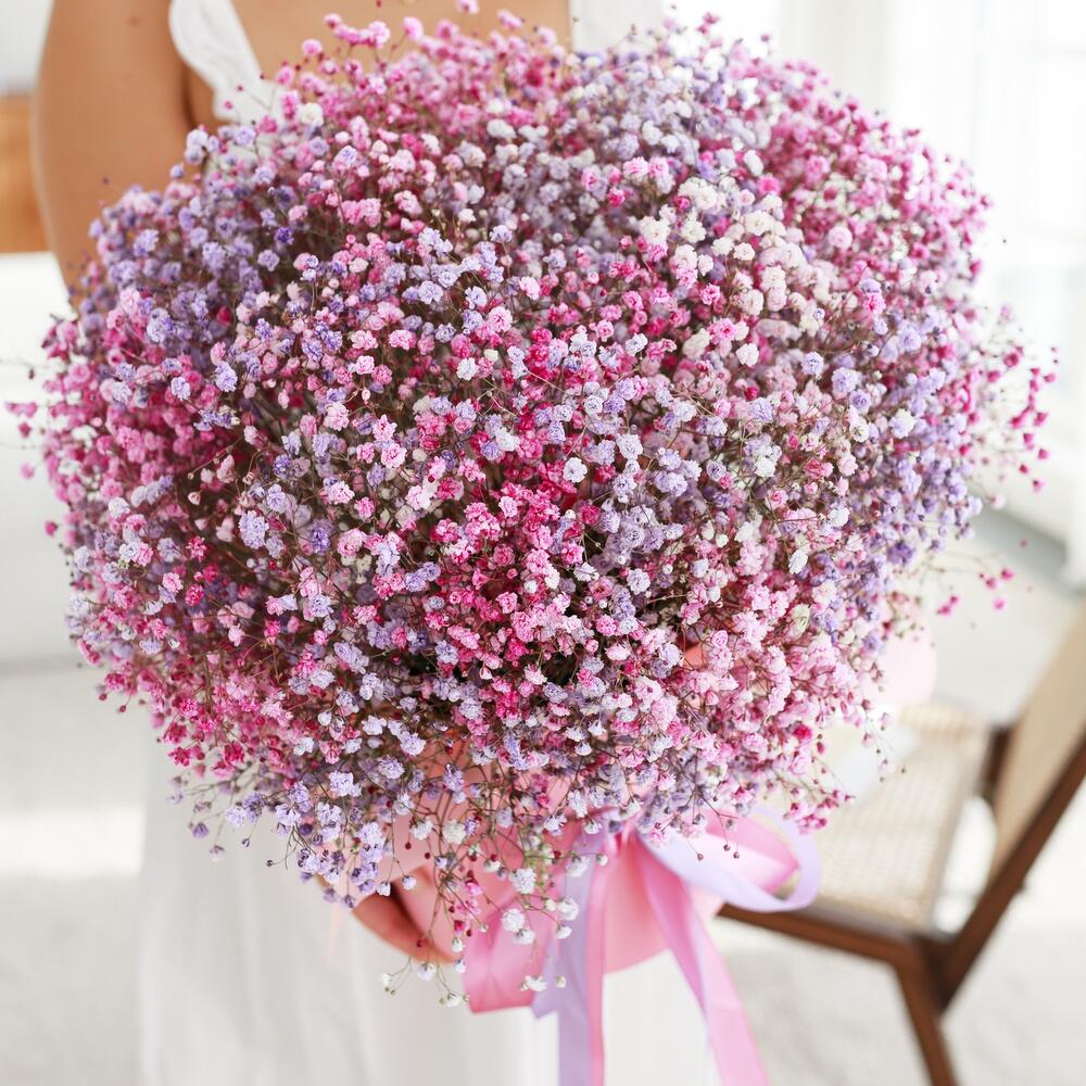 гипсофила цветная – 19 шт.Коробка шляпная – 1 шт.Губка флористическая – 3 шт.Пленка корейская – 1 шт.Лента атласная – 2 шт.