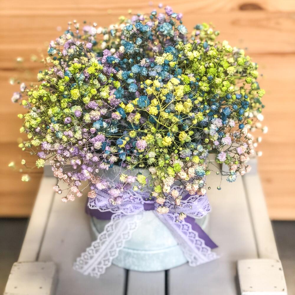 Гипсофила – 7 шт.Шляпная коробка – 1 шт.Оазис – 1 шт.Лента атласная – 2 шт.Пленка матовая – 1 шт.