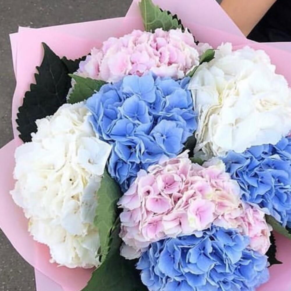 ассорти гортензий – 7 шт.Упаковка дизайнерская – 1 шт.Лента атласная – 2 шт.хорошее настроение – 100 шт.Открытка – 1 шт.инструкция по уходу за цветами – 1 шт.коробка переноска – 1 шт.Кризал – 1 шт.