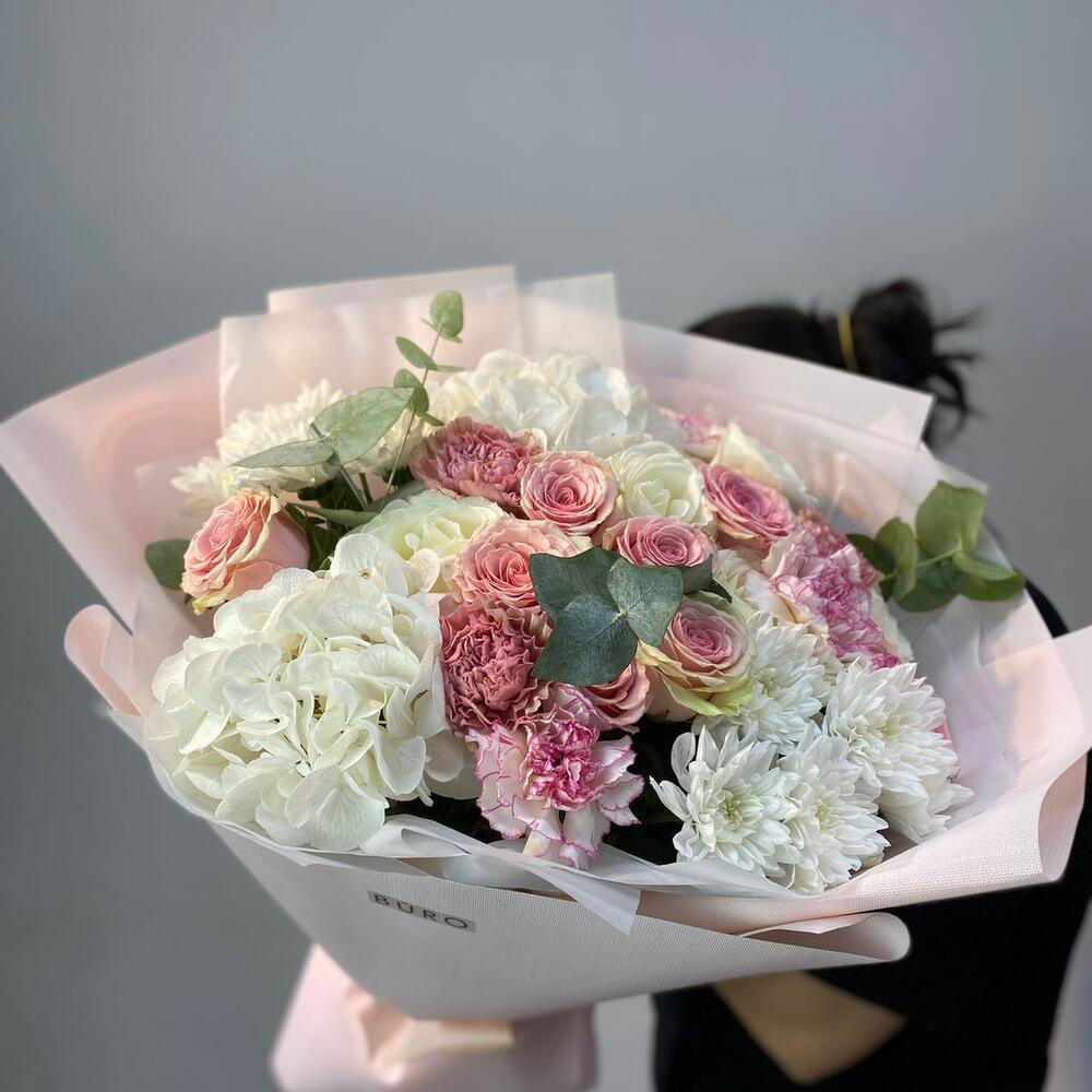 Эвкалипт – 1 шт. гортензии – 2 шт. голландские розы – 11 шт. диантусы – 5 шт. голландская кустовая хризантема – 2 шт.