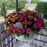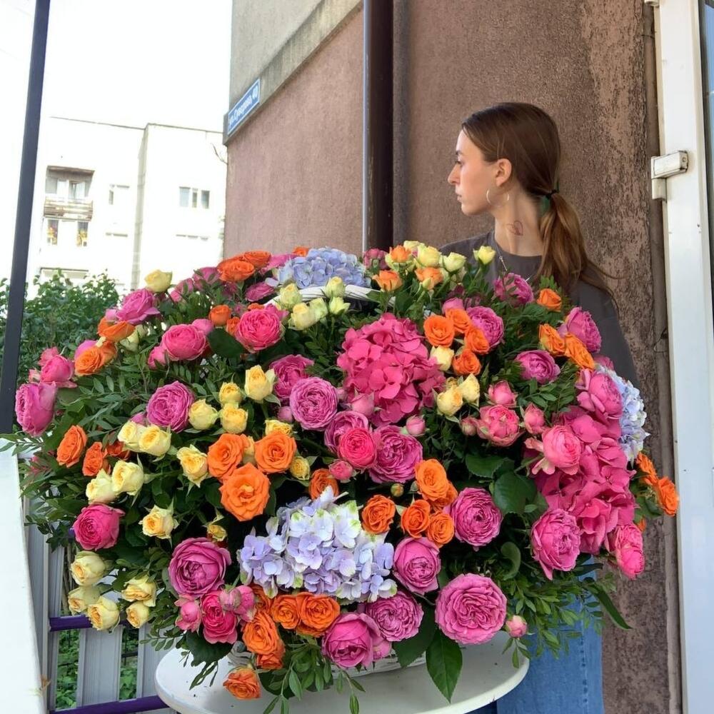 Гортензия – 10 шт.пионовидные розы кустовые Misty Bubbles – 20 шт.розы кустовые кремовые – 15 шт.розы кустовые оранжевые – 15 шт.Пистация пучок – 5 шт.Корзина плетеная – 1 шт.Оазис флористический – 5 шт.