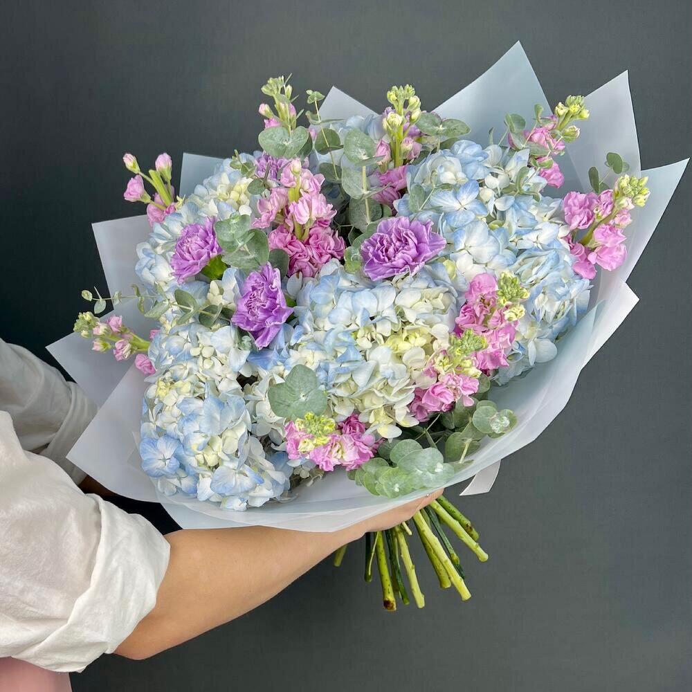 Гортензия – 5 шт.Маттиола – 10 шт.Эвкалипт – 5 шт.Диантус – 5 шт.