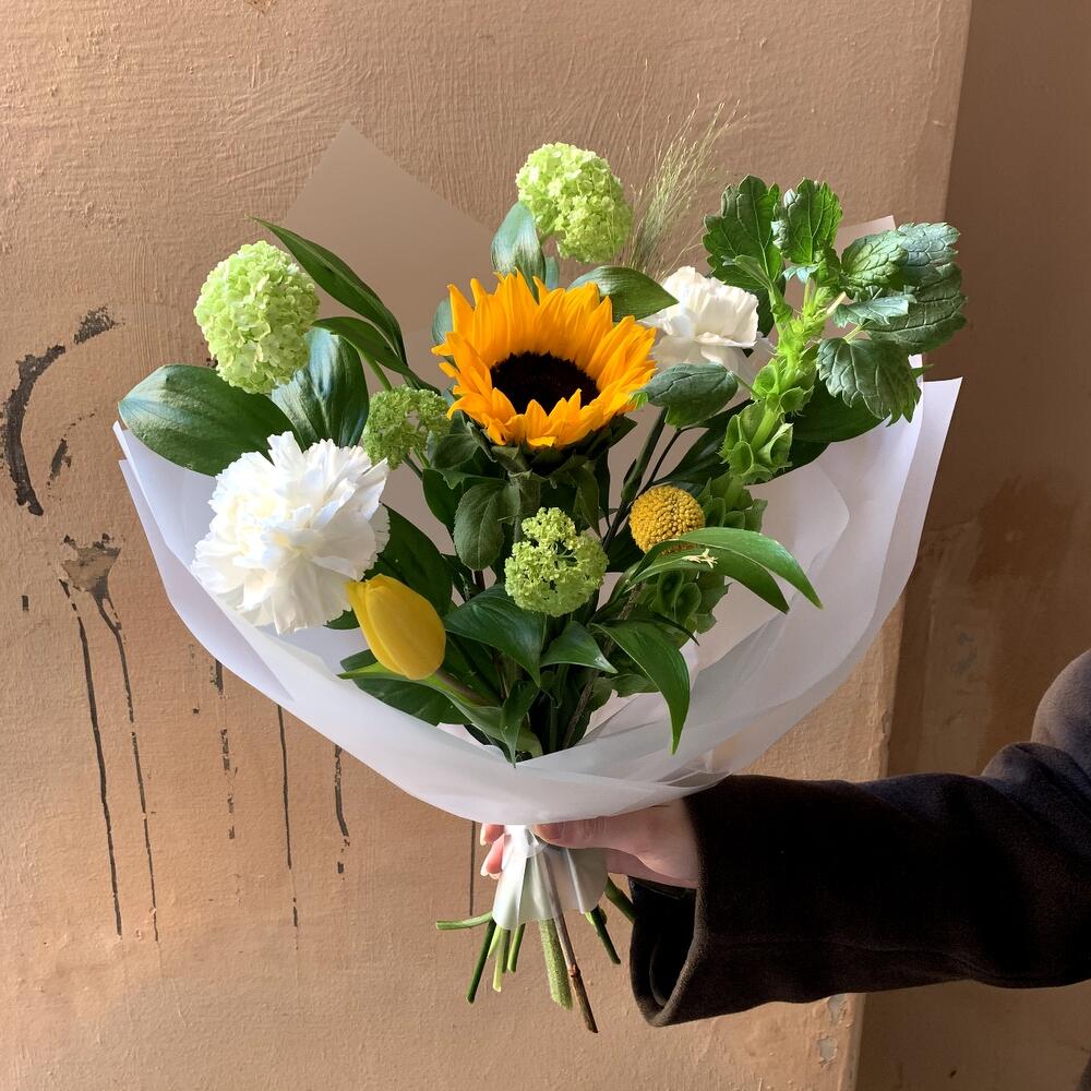 Вибурнум – 1 шт.Краспедия – 1 шт.Паникум – 1 шт.Подсолнух – 1 шт.Гвоздика белая – 2 шт.Тюльпан желтый – 1 шт.Рускус сочи – 5 шт.Молюцелла – 1 шт.Авторская упаковка – 1 шт.