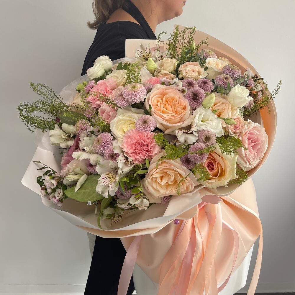 роза охара пионовидная – 11 шт.Кустовая роза – 11 шт.Сантинии – 11 шт.эустома белая – 3 шт.Гвоздика сортовая – 11 шт.Альстромерия – 11 шт.Зелень – 10 шт.Тишью белое – 2 шт.Фоамиран – 2 шт.Лента – 2 шт.
