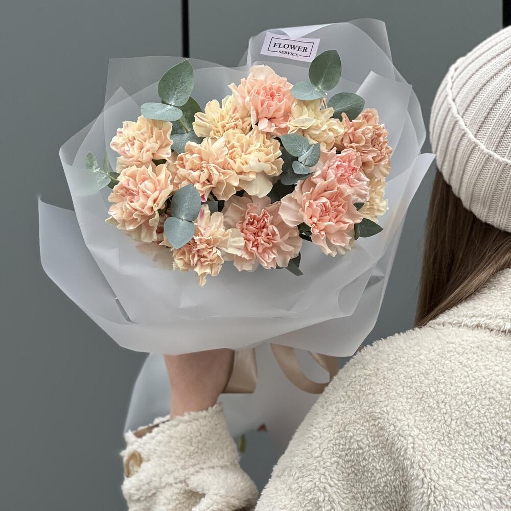 Эвкалипт – 1 шт. Оформление – 1 шт. гвоздика сортовая (диантус) – 15 шт.