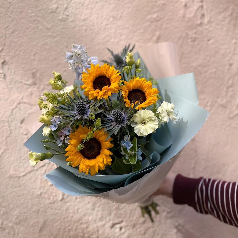 алкемилла – 2 шт.гвоздика соломио – 2 шт.Лизиантус – 1 шт.Дельфиниум – 1 шт.Подсолнух – 3 шт.Оксипеталум – 2 шт.Эрингиум – 1 шт.