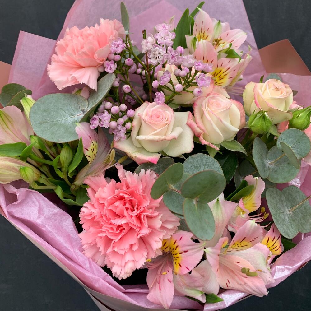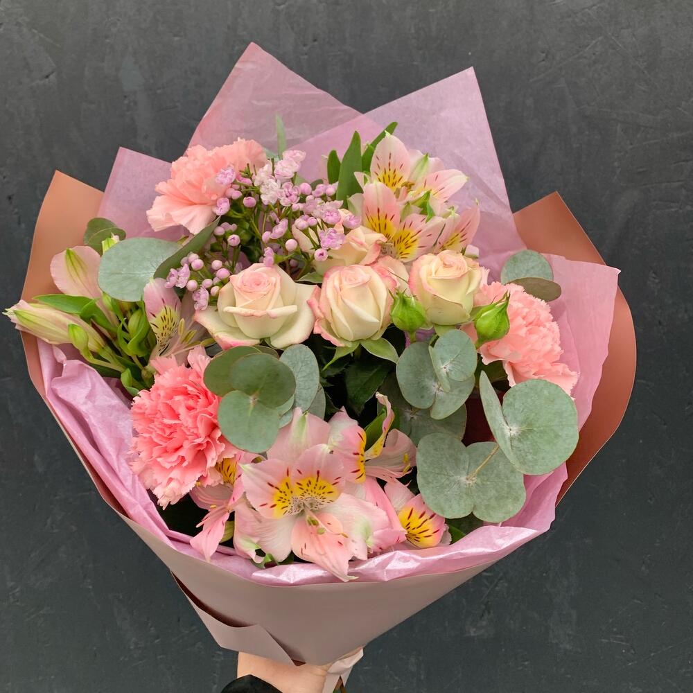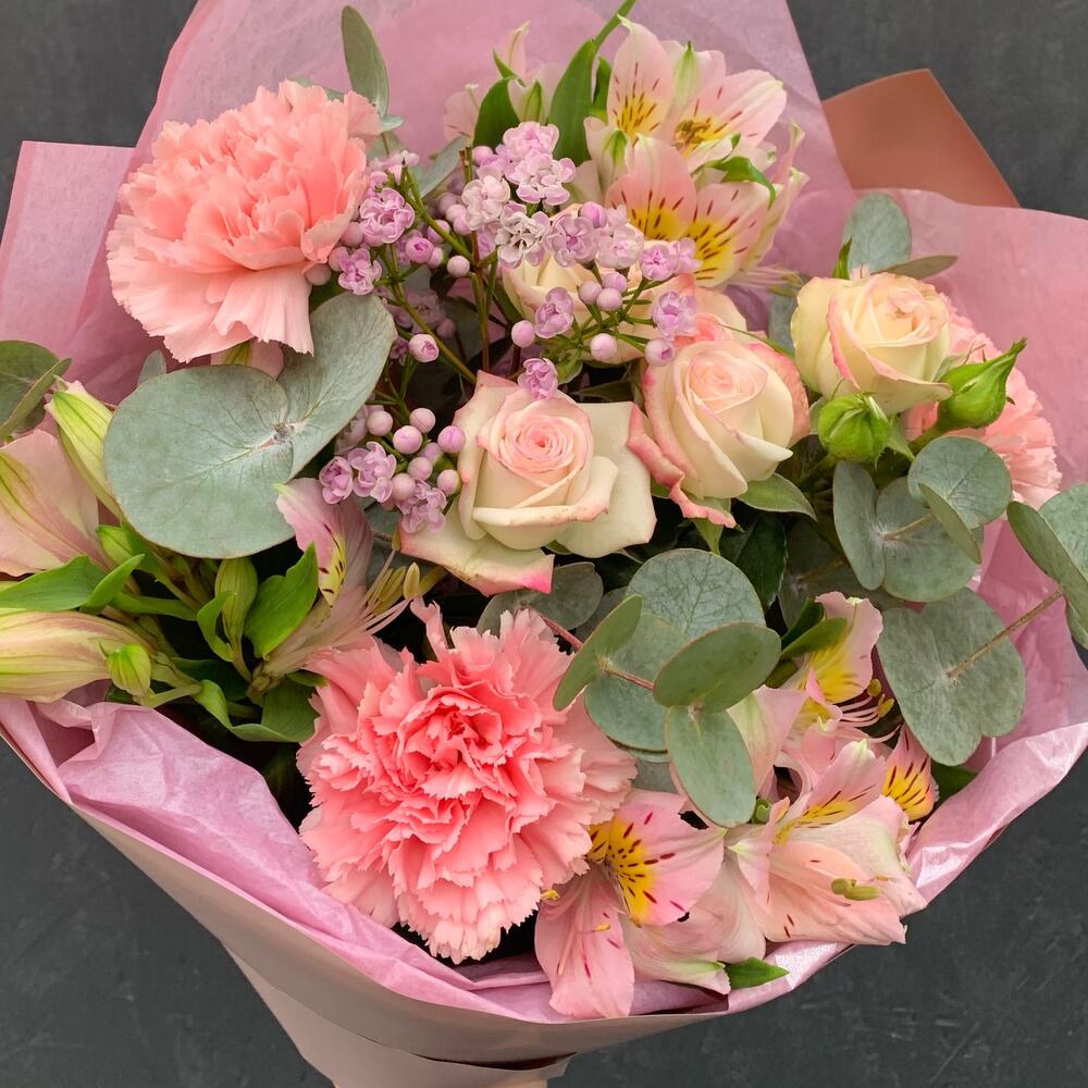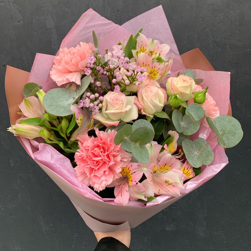 Гвоздика – 3 шт.Альстромерия – 3 шт.Роза кустовая – 1 шт.Ваксфлауэр – 1 шт.Эвкалипт – 2 шт.Упаковка дизайнерская – 2 шт.
