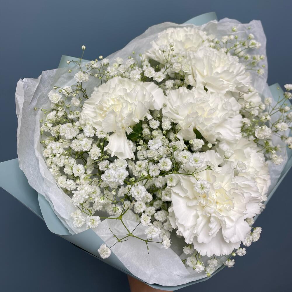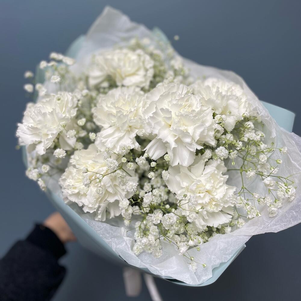 Диантус – 7 шт.Гипсофила – 3 шт.Упаковка – 1 шт.Тишью – 2 шт.Лента атласная – 1 шт.