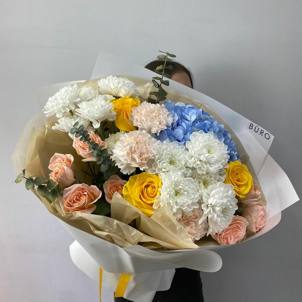 Сборная корзина из гортензий, лизиантусов, гвоздик, хризантем и роз