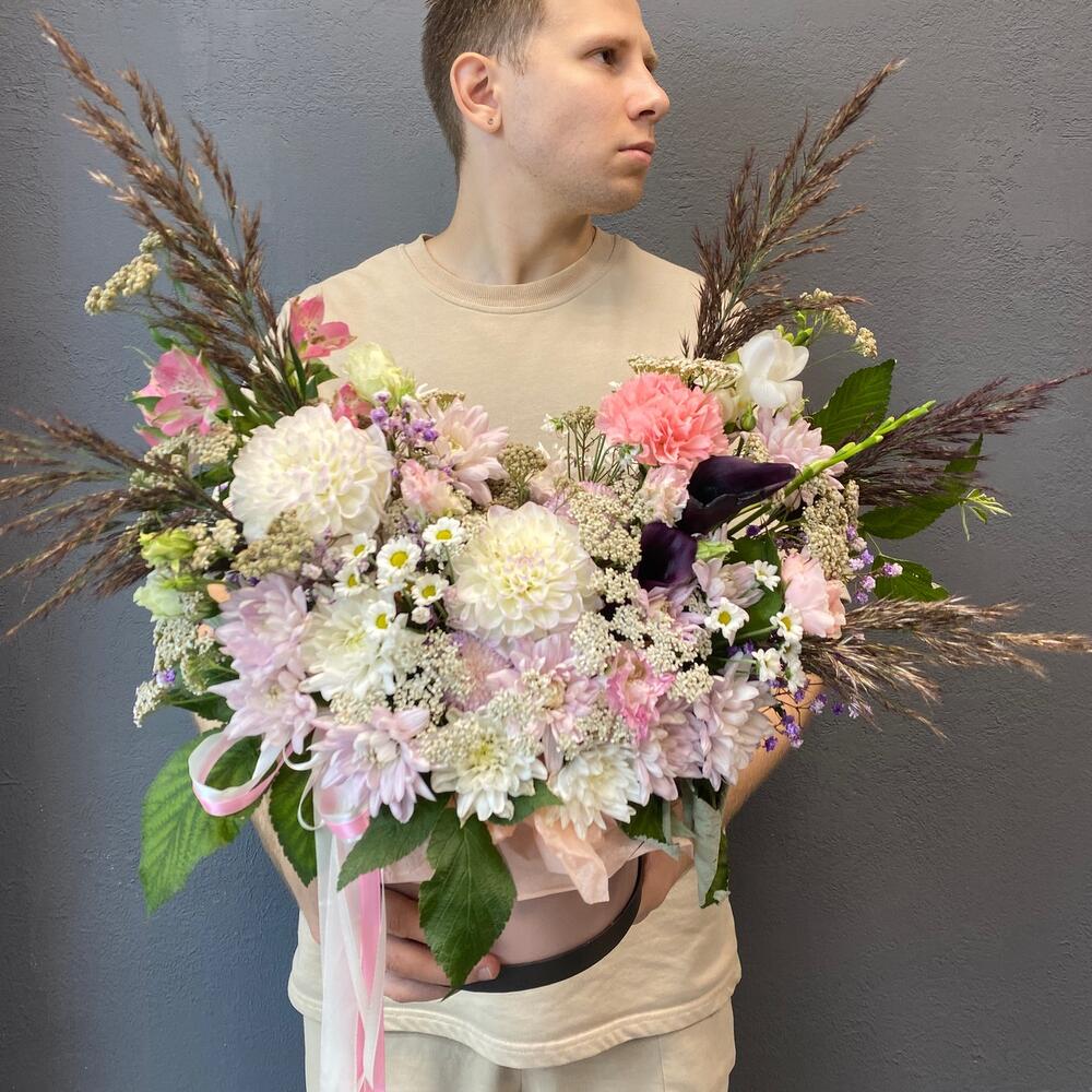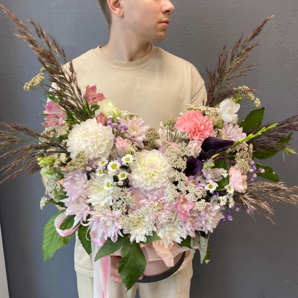 магнум – 2 шт.каллы – 2 шт.Альстромерия – 1 шт.Хризантема – 7 шт.Эустома – 2 шт.Тысячелистник – 5 шт.пампасная трава – 5 шт.Фрезия – 2 шт.Диантус сортовой – 1 шт.Сантини – 1 шт.Коробка шляпная – 1 шт.Оазис – 2 шт.Лента атласная – 2 шт.