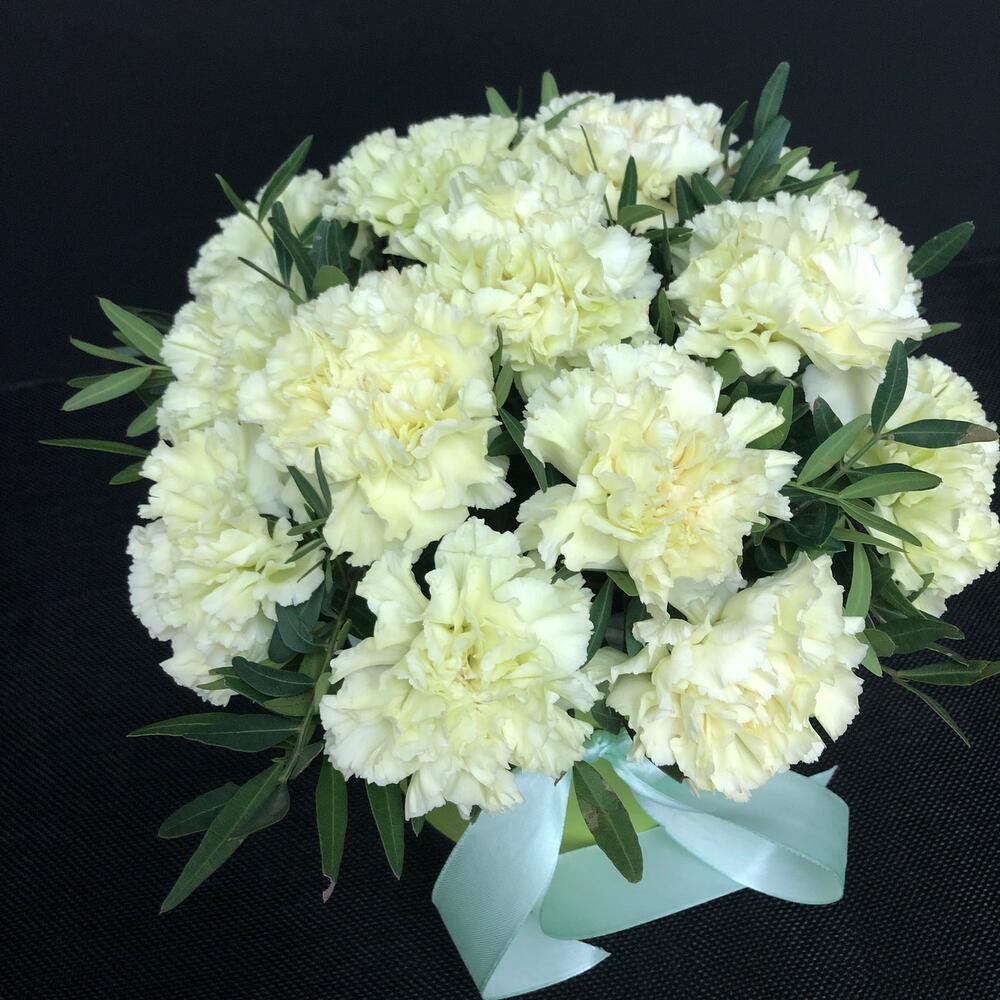 Диантус – 15 шт.Коробка шляпная – 1 шт.Оазис флористический – 1 шт.Фисташка – 2 шт.