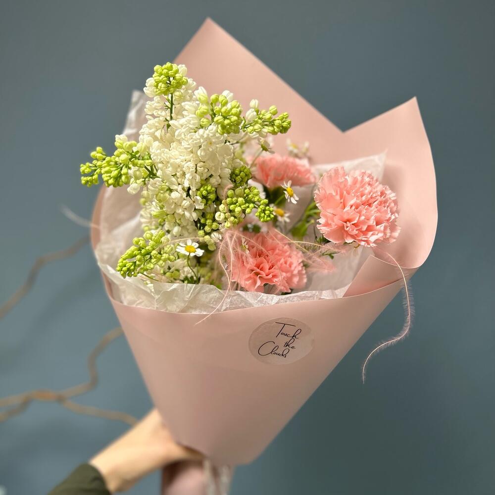 Нежный букет комплимент с гвоздикой, сиренью и матрикарией