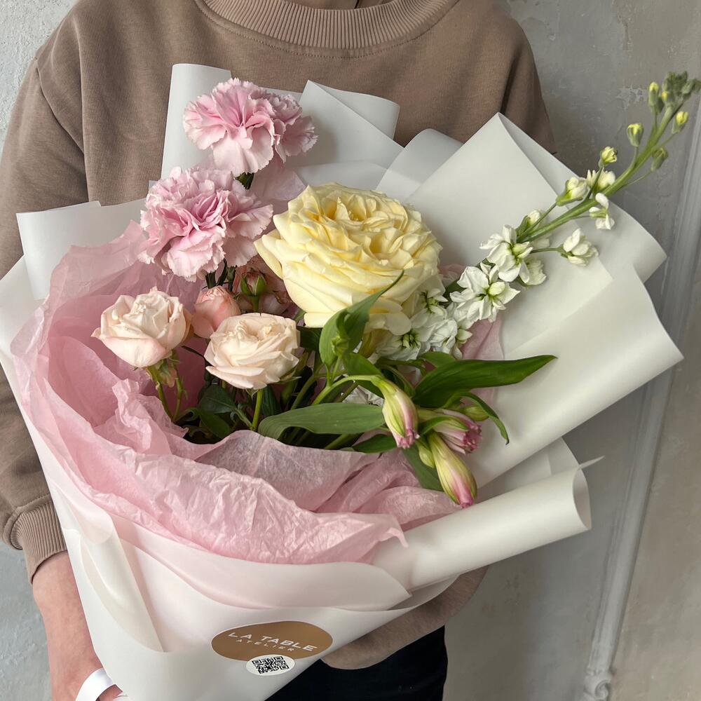 Роза – 2 шт.Диантус – 2 шт.Маттиола – 1 шт.Альстромерия – 1 шт.Упаковка дизайнерская – 1 шт.