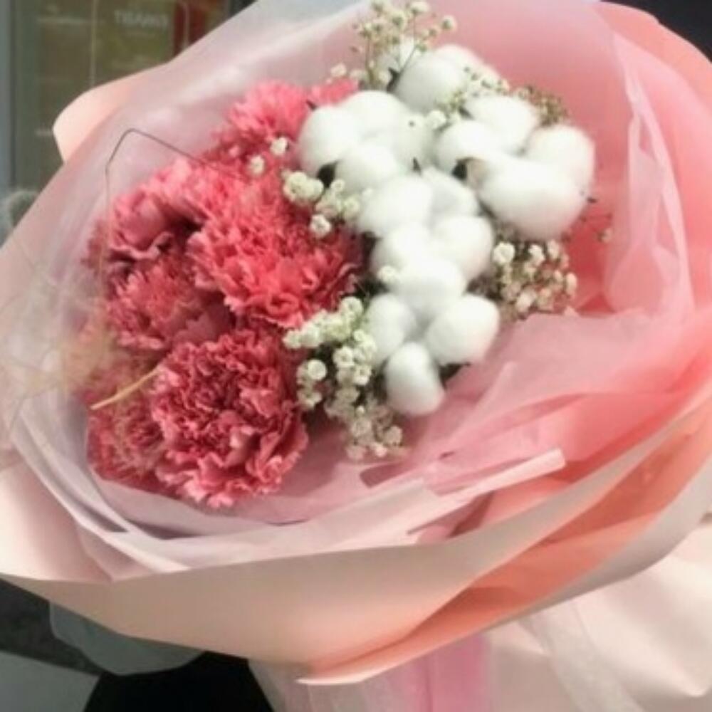 Гипсофила – 1 шт.Лента атласная – 2 шт.Тишью – 6 шт.Пленка матовая – 4 шт.Хлопок натуральный – 5 шт.Стифа – 5 шт.диантус розовый (гвоздика ) – 9 шт.