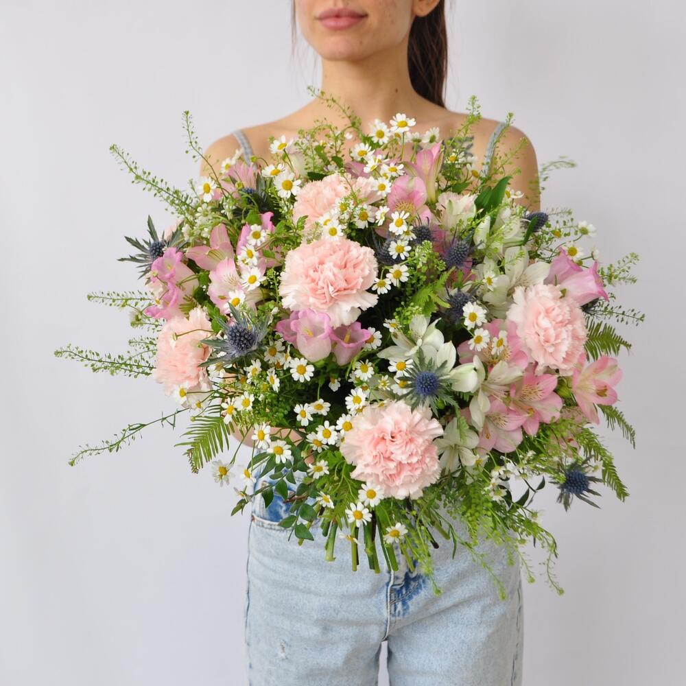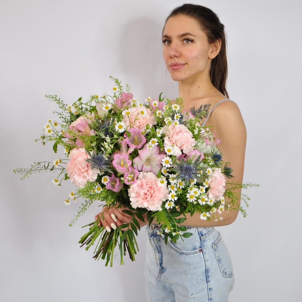 Ароматный букет с ромашками, колокольчиками и гвоздиками.Прелестные стойкие цветы слились в великолепном вальсе с голубыми колючками эрингиума, создавая непередаваемую атмосферу свободы, расслабления и счастья!Букет в европейском стиле, собран для вручения без упаковки!Будет красиво смотреться в вазе – круглый и нарядный со всех сторон!Истинная красота цветов для вашей ненаглядной.Доставим на воде и коробке, бережно и с заботой)
