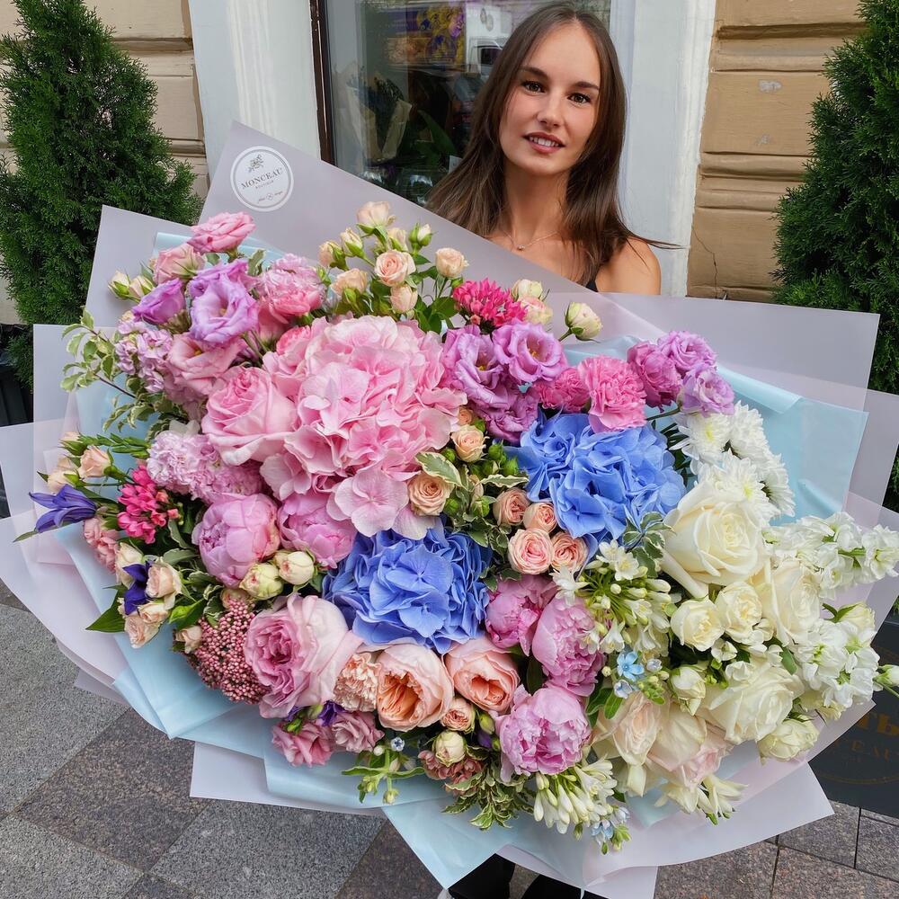 Гортензия – 3 шт.пионовидные розы – 10 шт.Клематис – 3 шт.кустовые розы – 10 шт.пионы – 5 шт.Лизиантус – 6 шт.Диантус – 10 шт.Озотамнус – 3 шт.Маттиола – 5 шт.Оксипеталум – 3 шт.Упаковка дизайнерская – 12 шт.Лента атласная – 4 шт.Аквабокс – 1 шт.транспортировочная упаковка – 1 шт.пленка транспортировочная – 1 шт.