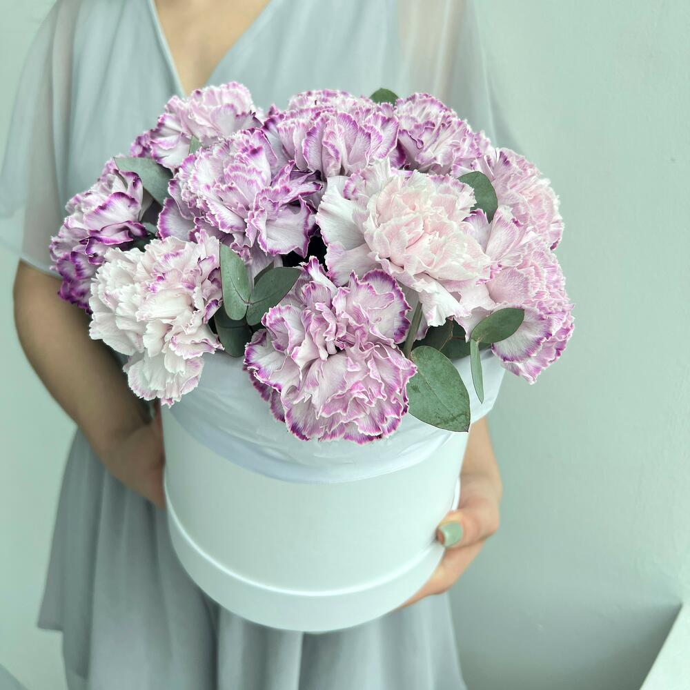 Шляпная коробка с фиолетовой гвоздикой и эвкалиптом, небольшого размера, 20 см в диаметре и 25 см высотой