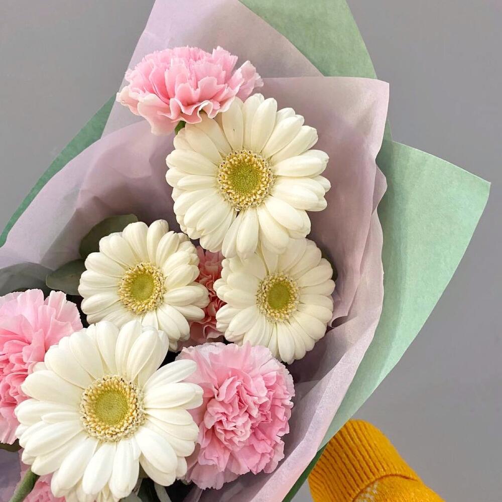герберы – 5 шт.Диантус сортовой – 4 шт.Эвкалипт – 3 шт.Тишью – 2 шт.Крафт – 2 шт.