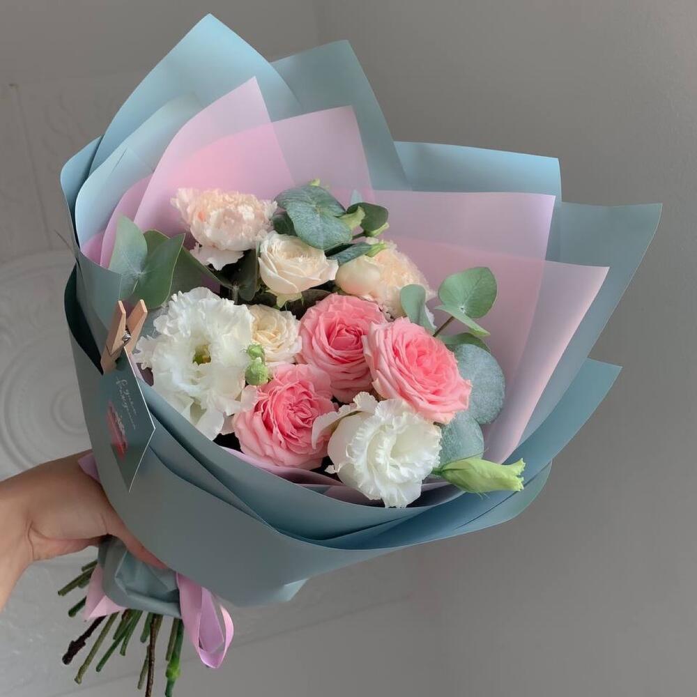Диантус – 2 шт.Упаковка дизайнерская – 1 шт.Эвкалипт Микс – 2 шт.эустома белая – 1 шт.кустовые розы – 2 шт.