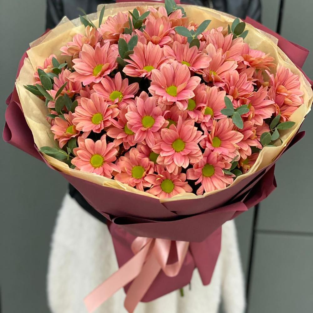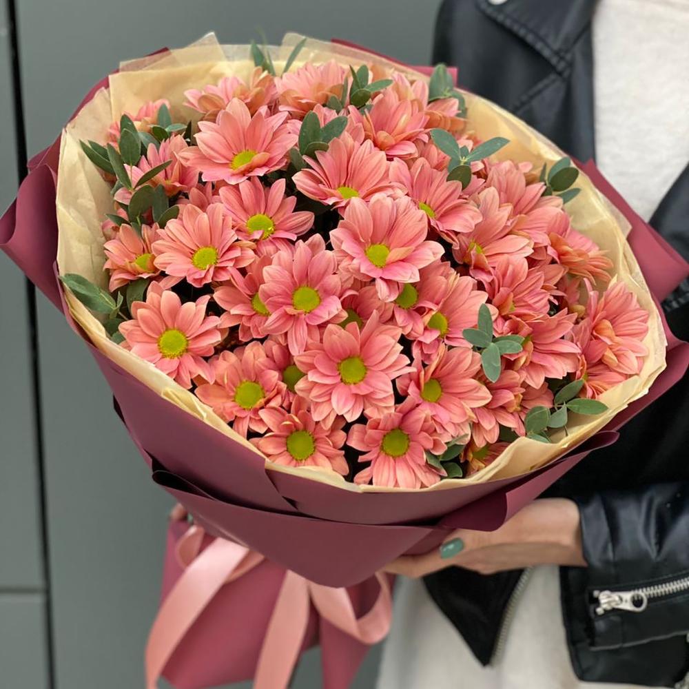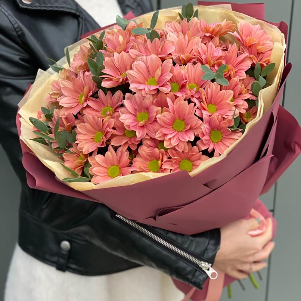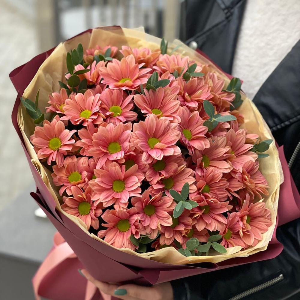 Букет из ромашковой персиковой хризантемы и эвкалипта в оформлении!