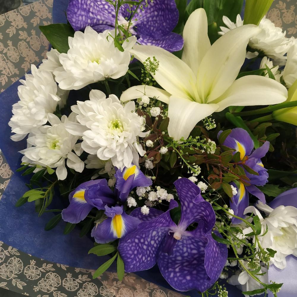 Орхидея Ванда – 3 шт.Хризантема кустовая – 3 шт.Азиатская лилия – 1 шт.Ирис – 3 шт.Фисташка – 1 шт.Зелень – 1 шт.Упаковка дизайнерская – 1 шт.Лента атласная – 1 шт.Гринбелл – 1 шт.Гипсофила – 1 шт.