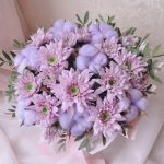 Хлопок – 7 шт.Хризантема кустовая – 3 шт.Коробка шляпная – 1 шт.листья фисташки – 1 шт.инструкция по уходу за цветами – 1 шт.любовь флориста – 1 шт.