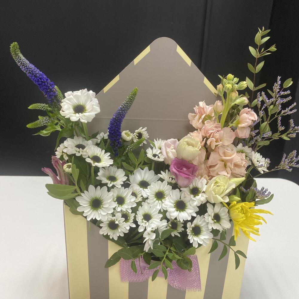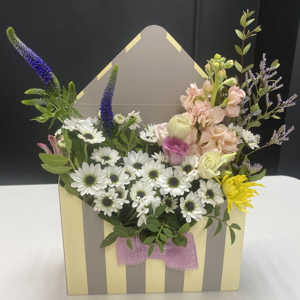 Вероника – 2 шт.Лизиантус – 1 шт.Маттиола – 1 шт.Хризантема – 3 шт.Оазис – 1 шт.Конверт – 1 шт.зелень фисташки – 1 шт.