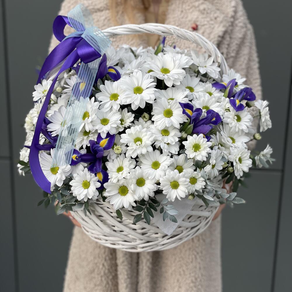 Корзина с белой ромашковой хризантемой и ирисами!